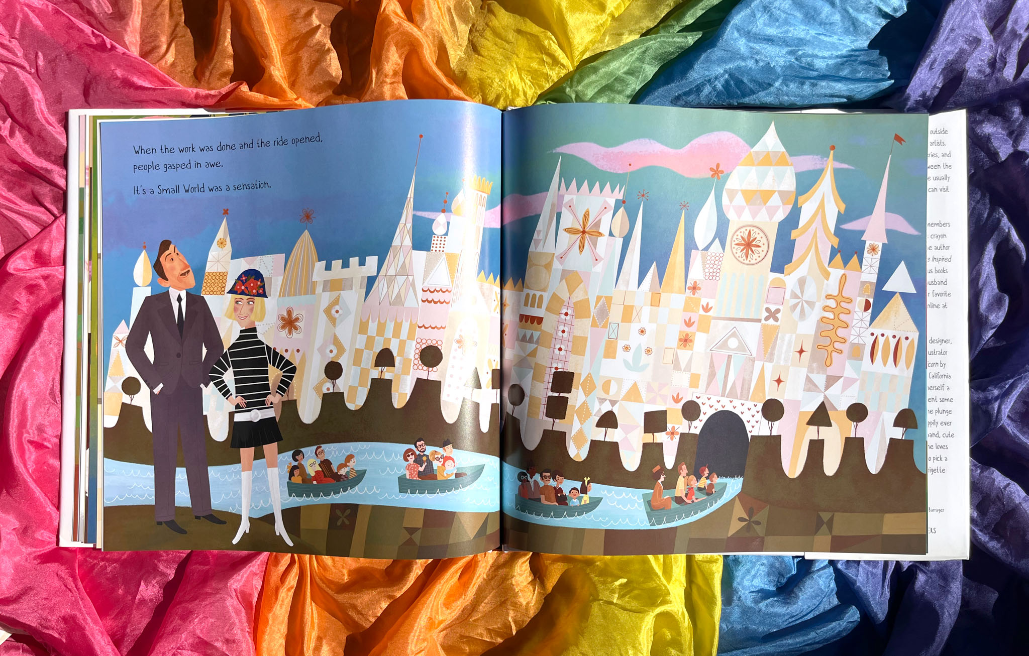 “Walt Disney Studios were pretty solidly a man’s world when Mary Blair and her passionate love of zingy color reported to work in 1940 . . . [K]ids and their adult readers…will be rewarded with a story of a woman worth knowing, and they will enjoy the ’60s mod colorscape and collage-like retro design that echos Blair’s ‘Small World’ achievement.”