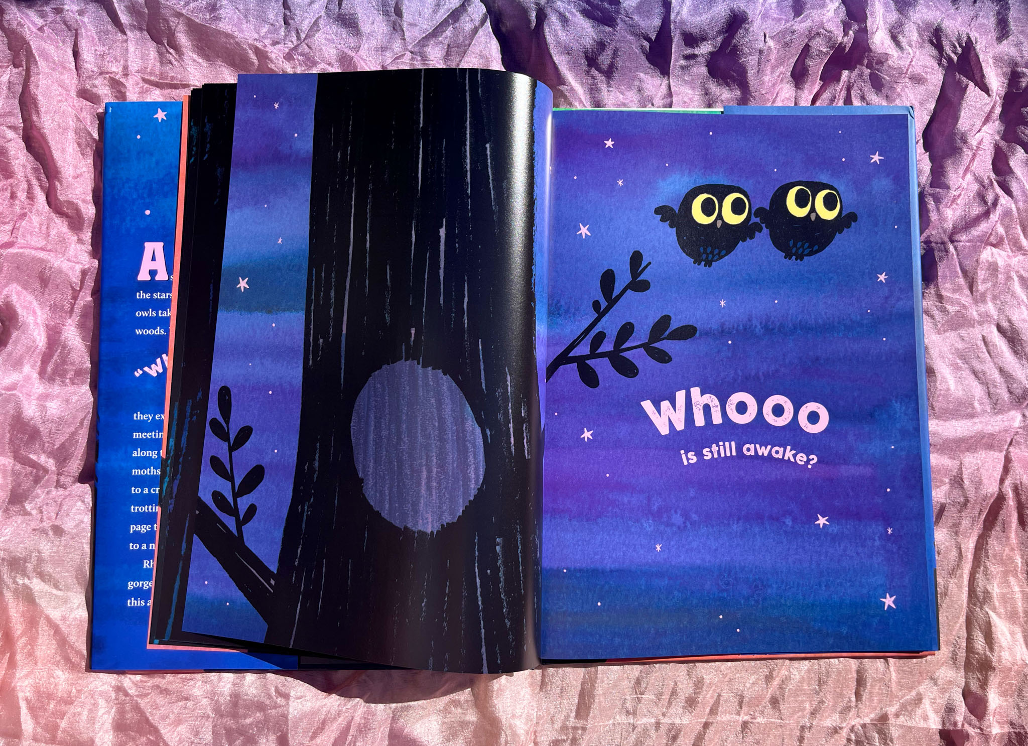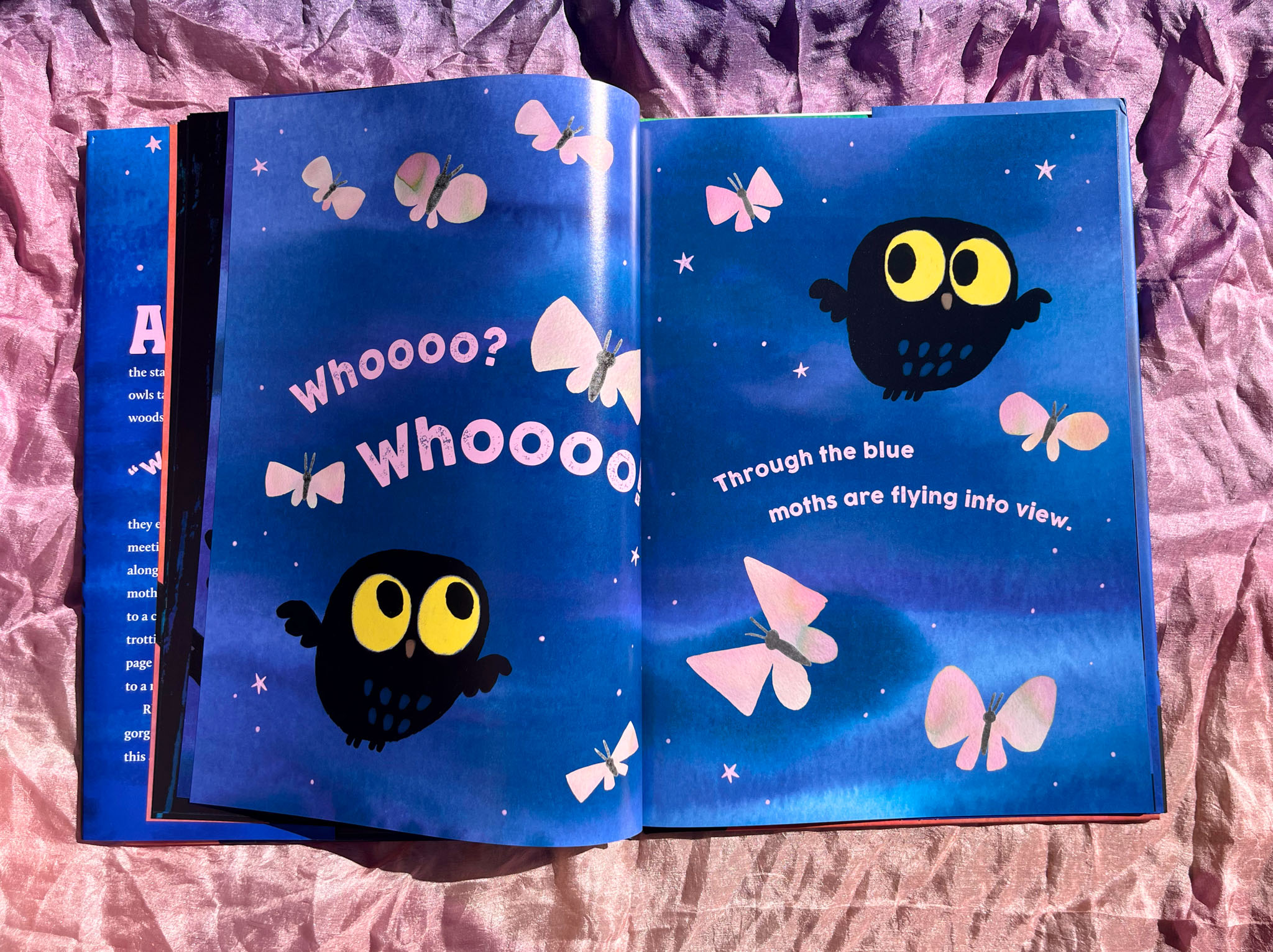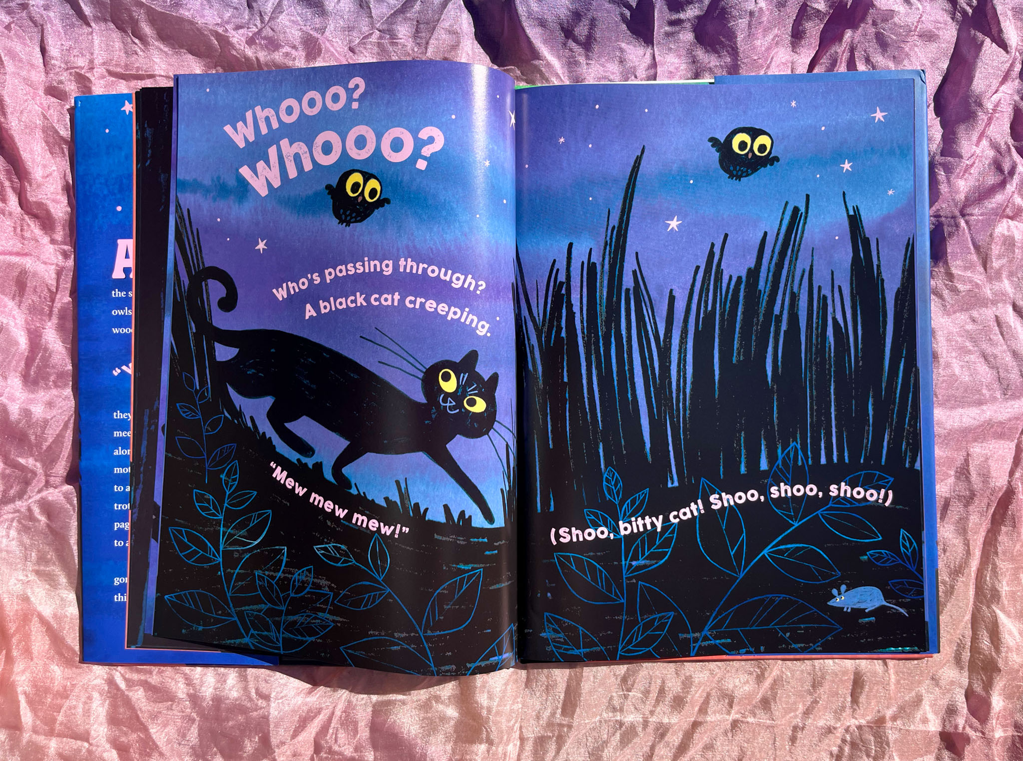 As the moon rises and the stars twinkle, two little owls take flight into moonlit woods. With a joyful “Whooo? Whooo?” they explore the night, meeting nocturnal friends along the way. From fluttering moths and playful raccoons to creeping black cats and trotting skunks, each page turn introduces readers to a new surprise.